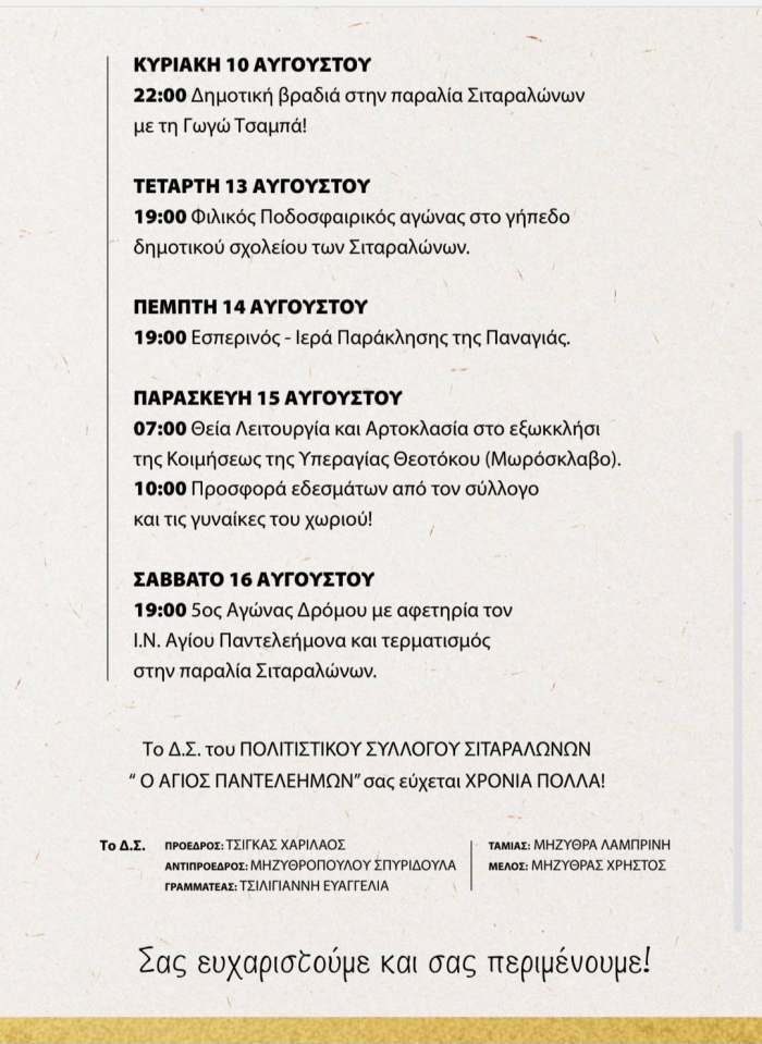 Ο Πολιτιστικός Σύλλογος Σιταραλώνων “Άγιος Παντελεήμων” παρουσιάζει το πρόγραμμα εκδηλώσεων 2025.