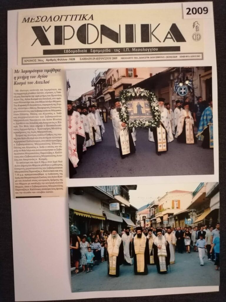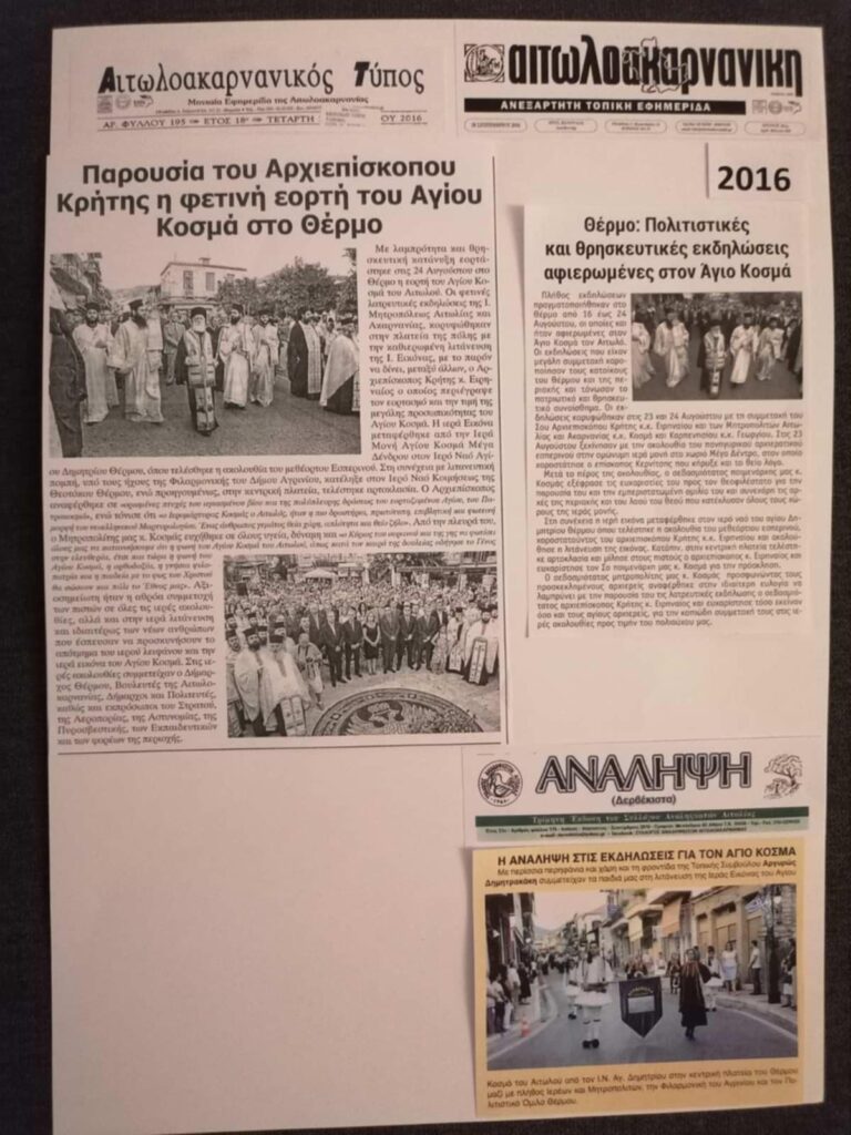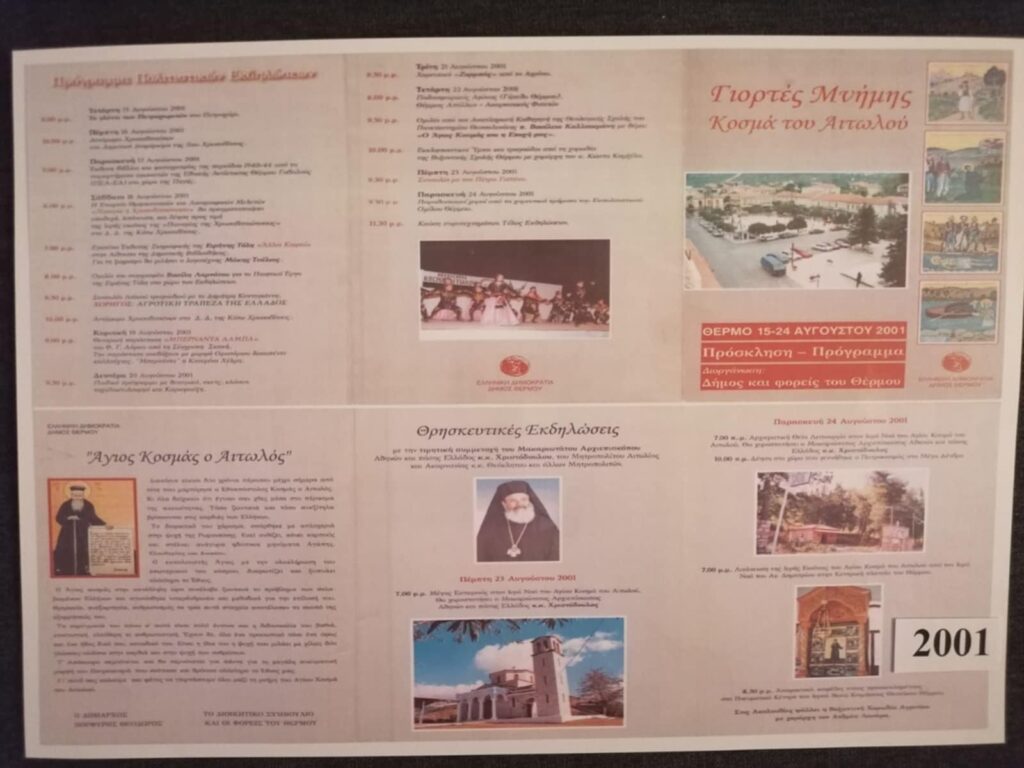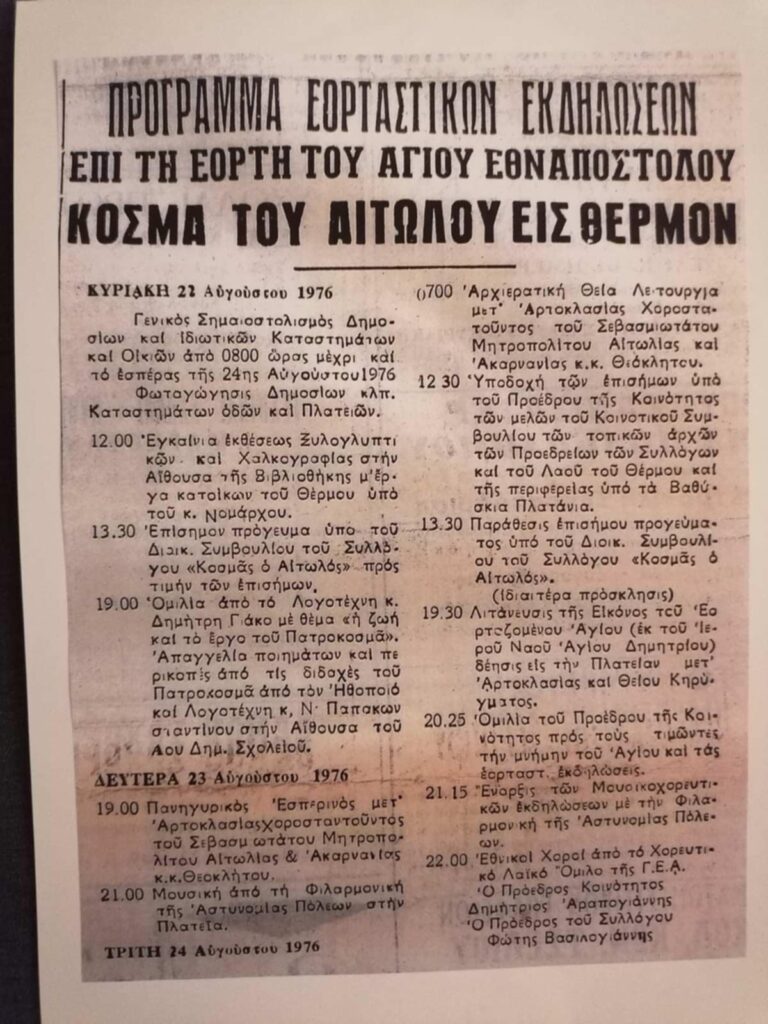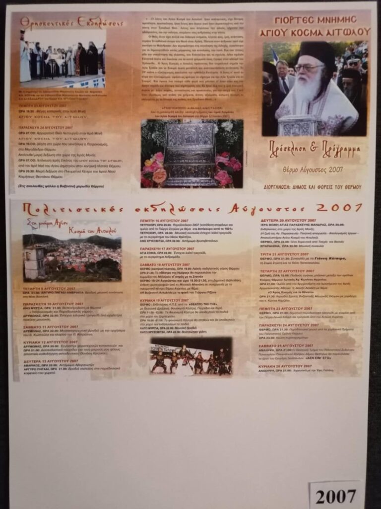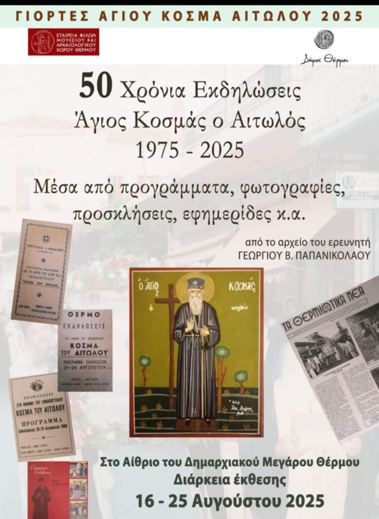Η Εταιρεία Φίλων Μουσείου και Αρχαιολογικού Χώρου Θέρμου, διοργανώνει μια ξεχωριστή έκθεση αφιερωμένη στα 50 χρόνια εκδηλώσεων προς τιμήν του Αγίου Κοσμά του Αιτωλού, καλύπτοντας την περίοδο 1975 έως και 2025.
