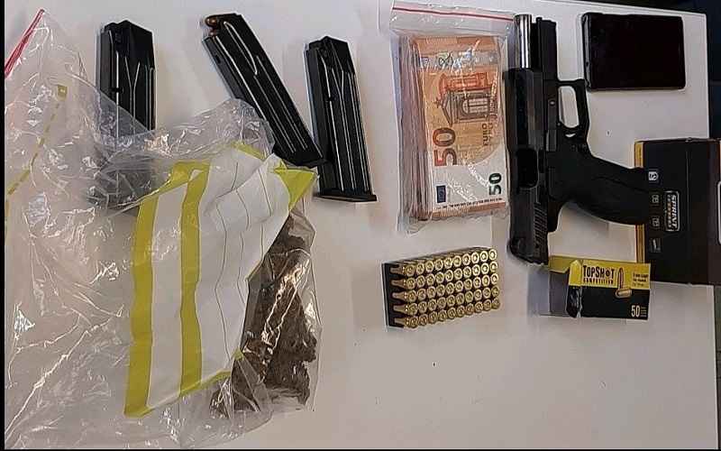 Κατασχέθηκαν πιστόλι, πιστόλι μπρελόκ, γεμιστήρες, φυσίγγια, πτυσσόμενη ράβδος, ποσότητα ακατέργαστης κάνναβης βάρους -136- γραμμαρίων και χρηματικό ποσό -9.350- ευρώ