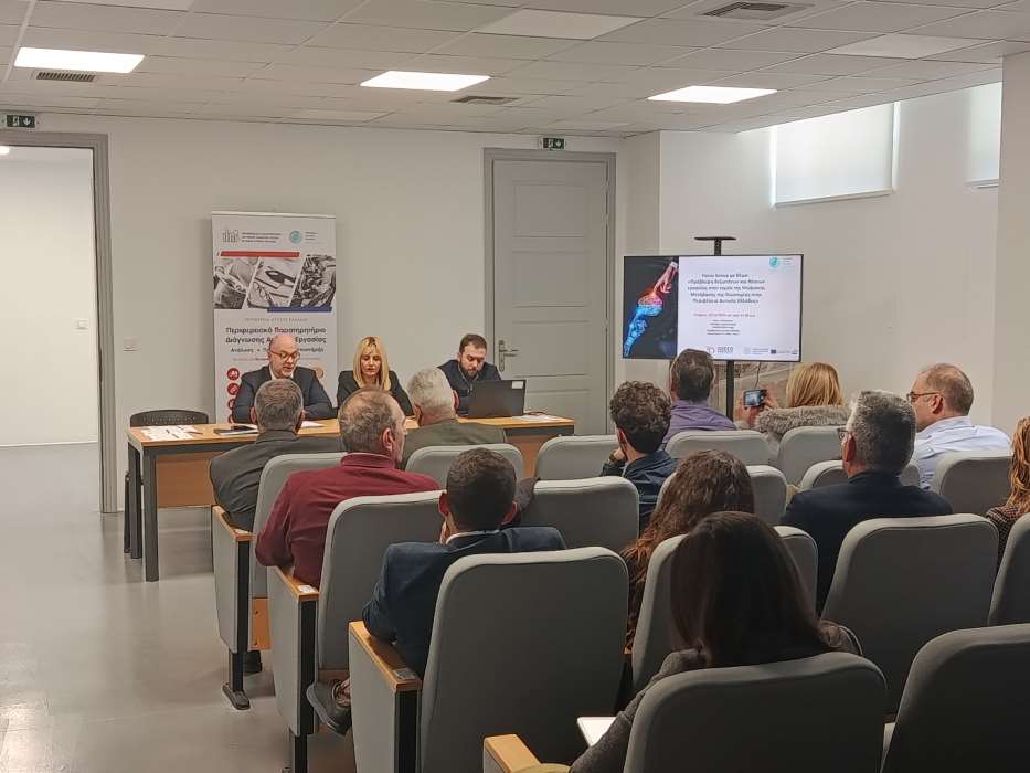 Ο Αντιπεριφερειάρχης Επιχειρηματικότητας Έρευνας και Καινοτομίας Τάκης Παπαδόπουλος πραγματοποίησε χαιρετισμό αναφέροντας σχετικά: «Η προσπάθειά μας για τη στήριξη της τοπικής οικονομίας εξελίσσεται βάσει στρατηγικής. Τα αποτελέσματα του έργου του Περιφερειακού Παρατηρητηρίου Διάγνωσης της Αγοράς Εργασίας θα βοηθήσουν να δημιουργηθούν προγράμματα πάνω στις ανάγκες της αγοράς εργασίας στην ψηφιακή και στην πράσινη μετάβαση. Στο πλαίσιο αυτό είναι σημαντικές οι προτάσεις εργοδοτικών φορέων, επαγγελματιών, εργαζομένων και επιχειρήσεων με σκοπό την ορθότερη διάγνωση των αναγκών εργασίας και τον προσανατολισμό του ανθρώπινου δυναμικού μας με βάση τις αναπτυξιακές μας προοπτικές».