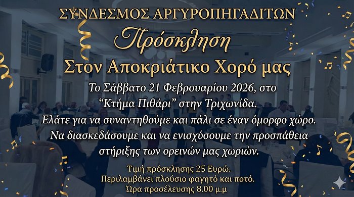 Ο Σύνδεσμος Αργυροπηγαδιτών προσκαλεί τα μέλη και τους φίλους του στον ετήσιο Αποκριάτικο Χορό του, που θα πραγματοποιηθεί το Σάββατο 21 Φεβρουαρίου 2026.