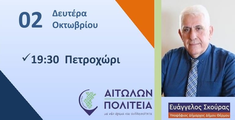 Αύριο, Δευτέρα 2 Οκτωβρίου 2023,στις 19:30, ο Συνδυασμός “ΑΙΤΩΛΩΝ ΠΟΛΙΤΕΙΑ ” με επικεφαλής τον κ.Ευάγγελο Σκούρα, Υποψήφιο Δήμαρχο Δήμου Θέρμου, θα επισκεφθεί το Πετροχώρι Θέρμου.