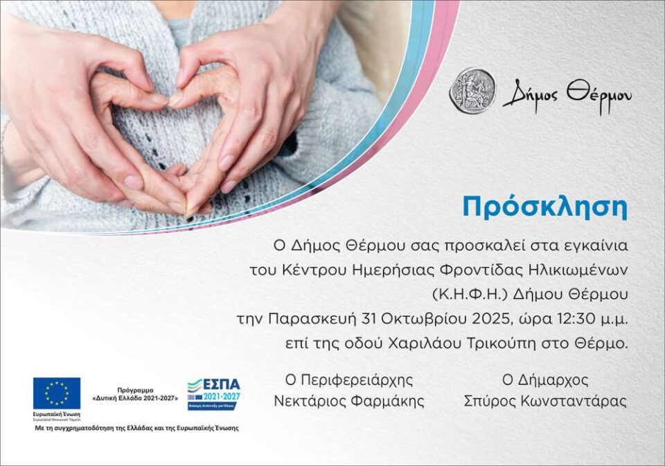 Ο Δήμος Θέρμου ανακοινώνει τη διοργάνωση των εγκαινίων του νέου Κέντρου Ημερήσιας Φροντίδας Ηλικιωμένων (Κ.Η.Φ.Η.). Η εκδήλωση θα πραγματοποιηθεί αύριο, Παρασκευή 31 Οκτωβρίου 2025, στις 12:30 μ.μ., επί της οδού Χαριλάου Τρικούπη στο Θέρμο.
