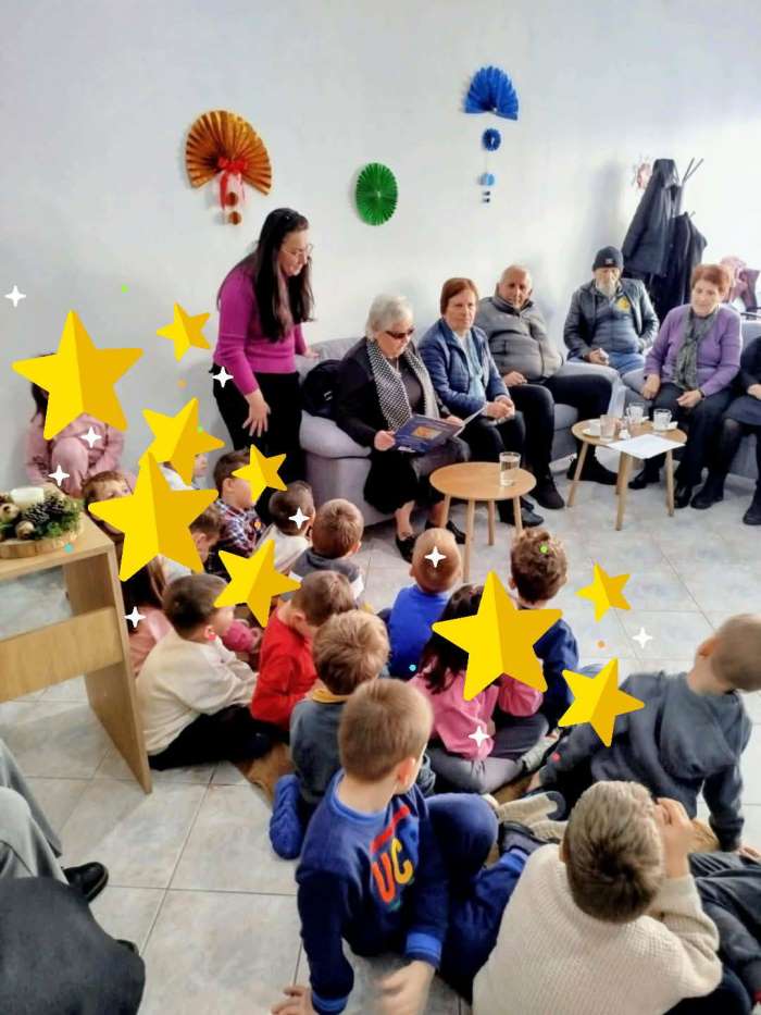 Μια γιαγιά διάβασε με συγκίνηση το παραμύθι  «Τα πιο χιονισμένα Χριστούγεννα», καθηλώνοντας μικρούς και μεγάλους. Τα νήπια τραγούδησαν με ενθουσιασμό τα χριστουγεννιάτικα κάλαντα, ενώ οι ηλικιωμένοι ανταπέδωσαν με αγαπημένα χριστουγεννιάτικα τραγούδια, δημιουργώντας μια μοναδική, ζεστή γιορτινή στιγμή γεμάτη χαμόγελα και συγκίνηση.