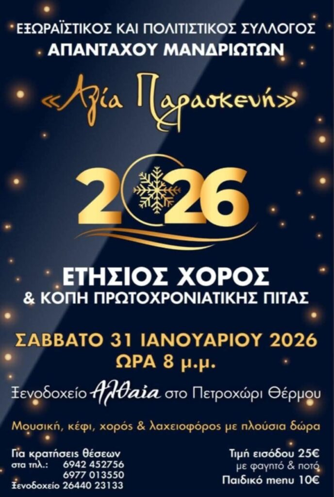 Ο Εξωραϊστικός και Πολιτιστικός Σύλλογος Απανταχού Μανδριωτών «Η Αγία Παρασκευή» προσκαλεί τα μέλη και τους φίλους του στον ετήσιο χορό και την κοπή της πρωτοχρονιάτικης πίτας, που θα πραγματοποιηθεί το Σάββατο 31 Ιανουαρίου 2026.