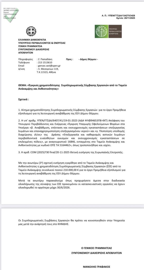 Εγκρίθηκε από το Ταμείο Ανάκαμψης και Ανθεκτικότητας η χρηματοδότηση ύψους 210.000 ευρώ για τη σύναψη Συμπληρωματικής Σύμβασης Εργασιών στο έργο «Προμήθεια εξοπλισμού για τη λειτουργική αναβάθμιση της Εγκατάστασης Επεξεργασίας Λυμάτων (ΕΕΛ) Δήμου Θέρμου». Η σχετική απόφαση εκδόθηκε από τη Γενική Γραμματεία Συντονισμού Διαχείρισης Αποβλήτων του Υπουργείου Περιβάλλοντος και Ενέργειας.