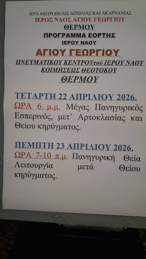 Με λαμπρότητα θα τιμηθεί η μνήμη του Αγίου Μεγαλομάρτυρος Γεωργίου του Τροπαιοφόρου στο Θέρμο, με επίκεντρο το παρεκκλήσιο του Αγίου Γεωργίου που στεγάζεται στο Πνευματικό Κέντρο του Ιερού Ναού Κοιμήσεως της Θεοτόκου.