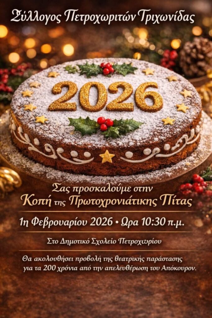 Ο Σύλλογος Πετροχωριτών Τριχωνίδας προσκαλεί τα μέλη και τους φίλους του στην καθιερωμένη εκδήλωση για την κοπή της πρωτοχρονιάτικης πίτας, η οποία θα πραγματοποιηθεί την Κυριακή 1η Φεβρουαρίου 2026.