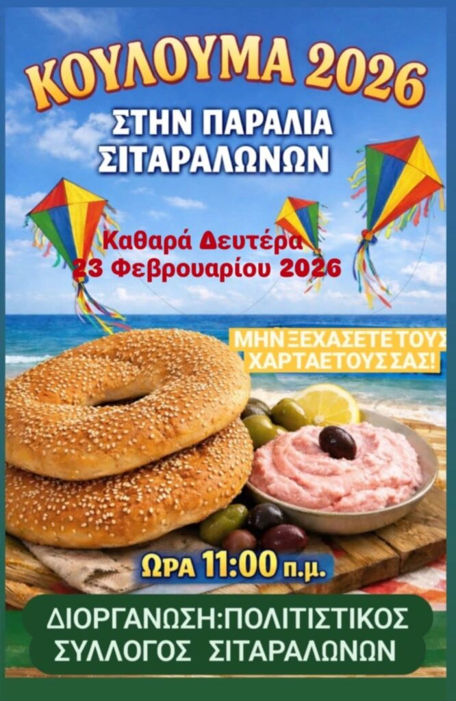 Η εκδήλωση «Κούλουμα 2026» θα πραγματοποιηθεί την Καθαρά Δευτέρα, 23 Φεβρουαρίου 2026, στην Παραλία Σιταραλώνων, με ώρα έναρξης τις 11:00 π.μ.