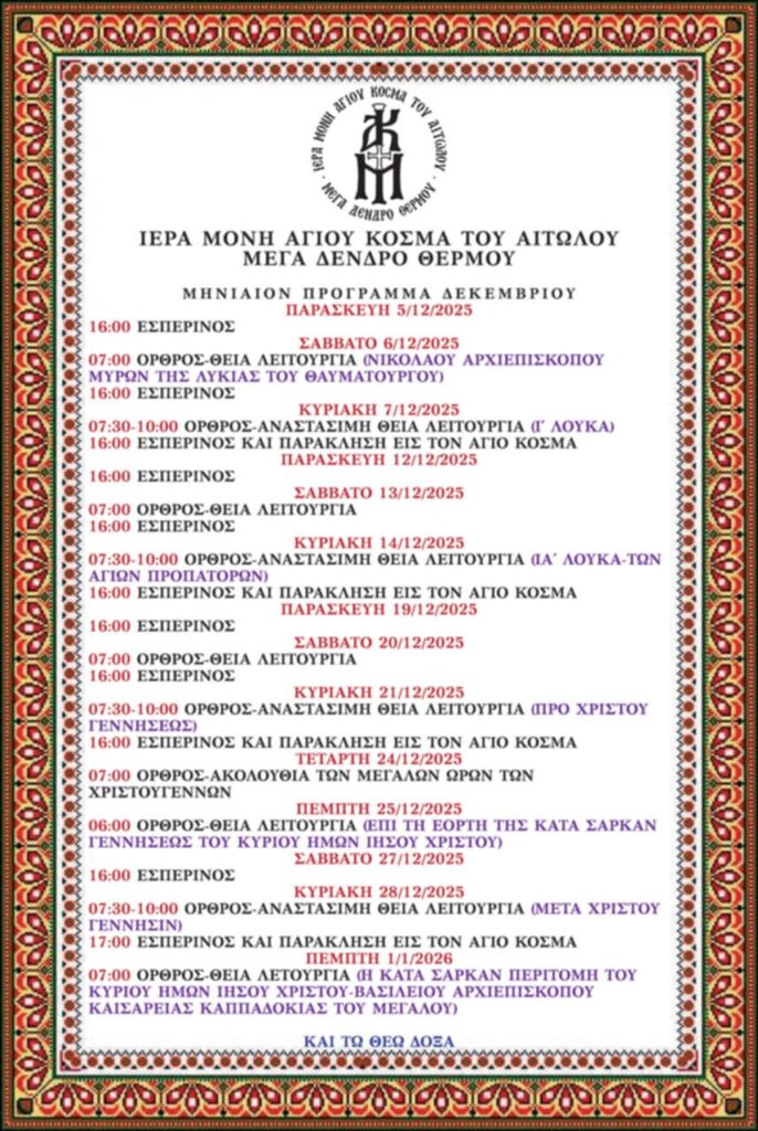Νέα απο το ΘέρμοΜέγα Δένδρο Θέρμου: Πρόγραμμα Δεκεμβρίου Ιερών Ακολουθιών στην Ιερά Μονή Αγίου Κοσμά του Αιτωλού Από Newsroom3 Δεκεμβρίου 20253 Δεκεμβρίου 2025 Η Ιερά Μονή Αγίου Κοσμά του Αιτωλού στο Μέγα Δένδρο Θέρμου ανακοινώνει το πρόγραμμα των Ιερών Ακολουθιών για τον μήνα Δεκέμβριο 2025: Ακολουθήστε το ThermoNews στο Google News Kάνετε Like στη σελίδα του ThermoNews.gr στο Facebook για να μαθαίνετε άμεσα ό,τι συμβαίνει !