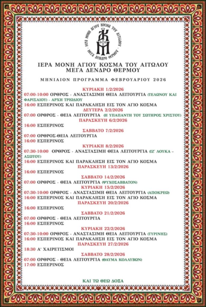 Νέα απο το ΘέρμοΜέγα Δένδρο Θέρμου: Πρόγραμμα Ιερών Ακολουθιών στην Ιερά Μονή Αγίου Κοσμά του Αιτωλού Φεβρουαρίου 2026 Από Newsroom6 Φεβρουαρίου 20266 Φεβρουαρίου 2026 Η Ιερά Μονή Αγίου Κοσμά του Αιτωλού στο Μέγα Δένδρο Θέρμου ανακοινώνει το πρόγραμμα των ιερών ακολουθιών για τον μήνα Φεβρουάριο 2026: Ακολουθήστε το ThermoNews στο Google News Kάνετε Like στη σελίδα του ThermoNews.gr στο Facebook για να μαθαίνετε άμεσα ό,τι συμβαίνει !