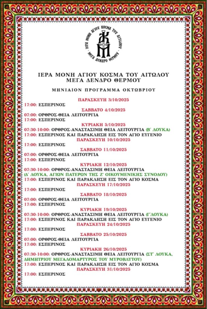 Νέα απο το ΘέρμοΜέγα Δένδρο Θέρμου: Πρόγραμμα Οκτωβρίου Ιερών Ακολουθιών στην Ιερά Μονή Αγίου Κοσμά του Αιτωλού Από Newsroom30 Σεπτεμβρίου 202530 Σεπτεμβρίου 2025 Η Ιερά Μονή Αγίου Κοσμά του Αιτωλού στο Μέγα Δένδρο Θέρμου ανακοινώνει το πρόγραμμα των ιερών ακολουθιών για τον μήνα Οκτώβριο 2025: Ακολουθήστε το ThermoNews στο Google News Kάνετε Like στη σελίδα του ThermoNews.gr στο Facebook για να μαθαίνετε άμεσα ό,τι συμβαίνει !