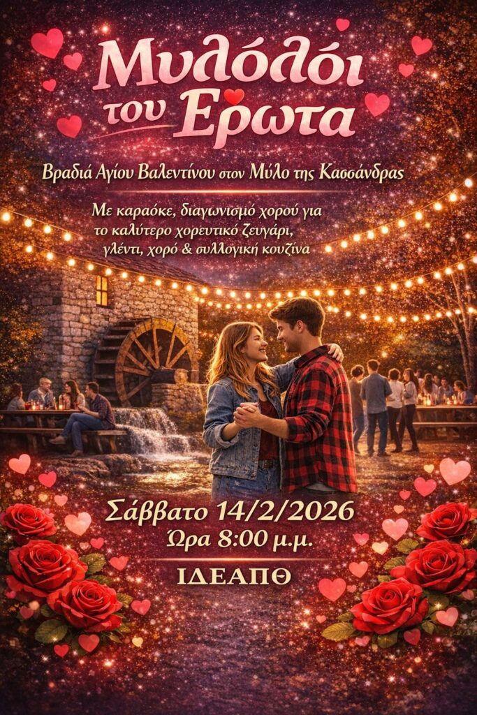 Η εκδήλωση, με τον τίτλο «Μυλολόι του Έρωτα», θα πραγματοποιηθεί στον ατμοσφαιρικό χώρο του Μύλου της Κασσάνδρας, ξεκινώντας στις 20:00.