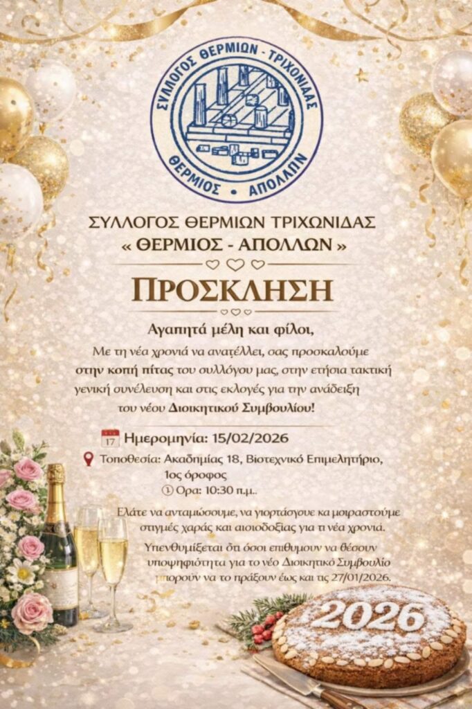 Σε μια σημαντική συνάντηση για τα μέλη και τους φίλους του καλεί ο Σύλλογος Θερμίων Τριχωνίδας «Θέρμιος Απόλλων», συνδυάζοντας τον θεσμικό του απολογισμό με την παραδοσιακή έναρξη της νέας χρονιάς.