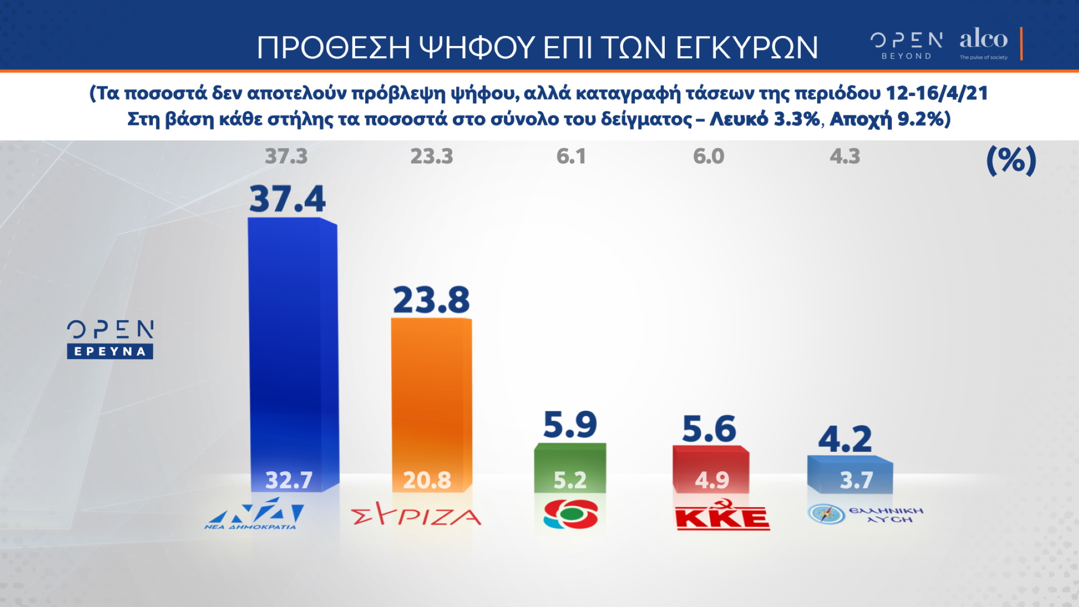 Οι εμβολιασμοί κατά του κορονοϊού, η σταδιακή χαλάρωση του lockdown, αλλά και οι ελεύθερες μετακινήσεις το Πάσχα, είναι μερικά από τα ερωτήματα που τέθηκαν σε δείγμα 1.000 ατόμων, από τις 12 έως τις 16 Απριλίου 2021, στη δημοσκόπηση της Alco, που διενεργήθηκε για το OPEN, και δίνει στο κυβερνών κόμμα σημαντική διαφορά έναντι του ΣΥΡΙΖΑ.