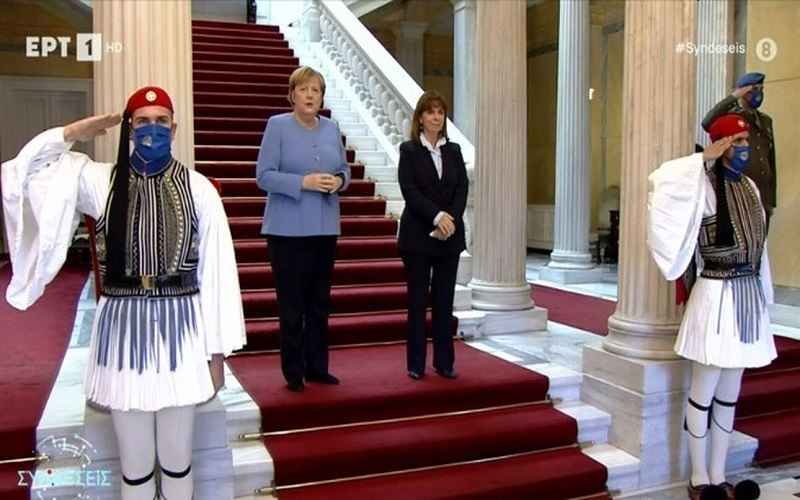 Υποδεχόμενη την καγκελάριο, η κυρία Σακελλαροπούλου δήλωσε: «Υποδέχομαι μια σπουδαία πολιτικό που διαμόρφωσε την πολιτική ζωή της Γερμανίας και της Ευρώπης για σχεδόν 2 δεκαετίες. Η παραμονή σας στο τιμόνι μιας σημαντικής ευρωπαϊκής δύναμης επί 16 χρόνια σας έφερε αντιμέτωπη με πολλές κρίσεις και προκλήσεις αλλά και αν συμβάλλατε αποφασιστικά σε καταστάσεις δύσκολες για την ευρωπαϊκή μας οικογένεια».