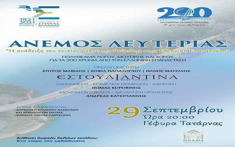 Πρόκειται για την εκδήλωση «Άνεμος Λευτεριάς», που φωτίζει εμβληματικές στιγμές του ’21 και θα πραγματοποιηθεί στη Γέφυρα Τατάρνας, την Τετάρτη 29 Σεπτεμβρίου 2021 και ώρα 20:00.