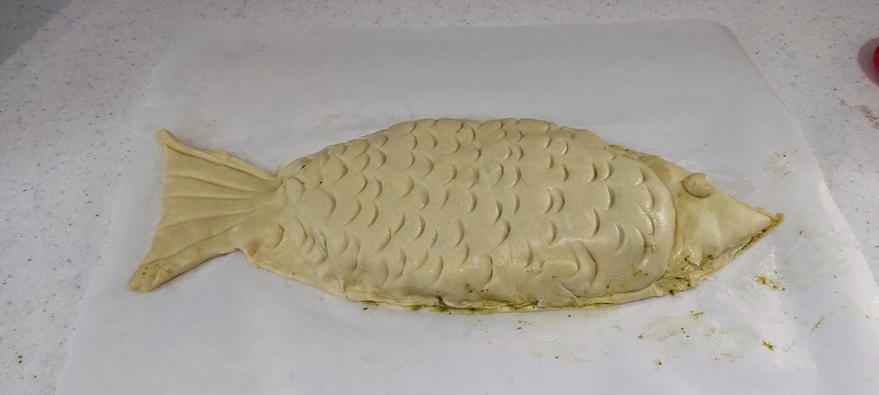 Στο κεφάλι που έχουμε κάνει τη μύτη του ψαριού το ανοίγουμε και κόβουμε από τη ζύμη που περισσεύει 3 τριγωνάκι και βάζουμε πέστο τριγωνάκι ζύμης, πέστο τριγωνάκι ζύμης και μια τελευταία φορά.