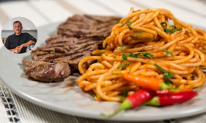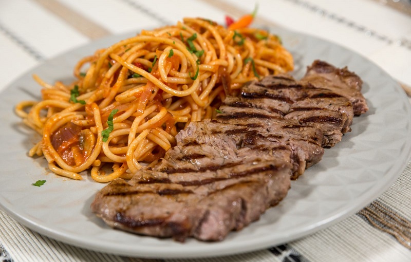 Βάζουμε να βράσουν τα μακαρόνια και αφαιρούμε 1-2 λεπτά από ότι λέει η συσκευασία . Παίρνουμε τη μπριζόλα ρίχνουμε ελαιόλαδο, αλάτι, πιπέρι και τη ρίχνουμε σε ένα τηγάνι με 2 κουταλιές ηλιέλαιο και ψήνουμε για 4 λεπτά από κάθε μεριά. Αφαιρούμε από το τηγάνι να ξεκουραστεί το κρέας και στο ίδιο τηγάνι ρίχνουμε το κρεμμύδι κομμένο στη μέση ροδέλες και τα μανιτάρια κομμένα φέτες. Αφού μαλακώσουν λίγο ρίχνουμε τις πιπεριές ψιλοκομμένες μετά τη σάλτσα ντομάτας και τα flakes pepperoncino και προσθέτουμε και το νερό από τα μακαρόνια ανακατεύοντας καλά. Προσθέτουμε πιπέρι και αλάτι αν χρειαστεί. Αφού πάρουν μια βράση προσθέτουμε τα μακαρόνια και τα ανακατεύουμε καλά. Σερβίρουμε με τυρί parmesana τριμμένη.