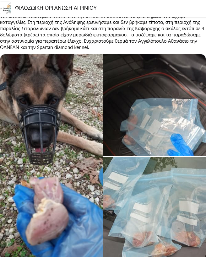 Αντίθετα, στην παραλία της Καψοράχης (Μακρυνεία), ο ειδικά εκπαιδευμένος σκύλος εντόπισε τέσσερα δολώματα από κρέας, τα οποία έφεραν έντονη οσμή φυτοφαρμάκου.