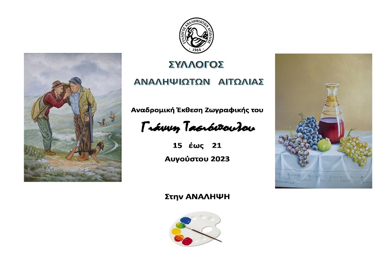 Με πρωτοβουλία του Συλλόγου Αναληψιωτιών Αιτωλίας, διοργανώνεται Αναδρομική Έκθεση Ζωγραφικής του Γιάννη Τασιόπουλου στις 15 – 21 Αυγούστου 2023 στην Πλατεία Αγίου Νικολάου, Αναλήψεως.