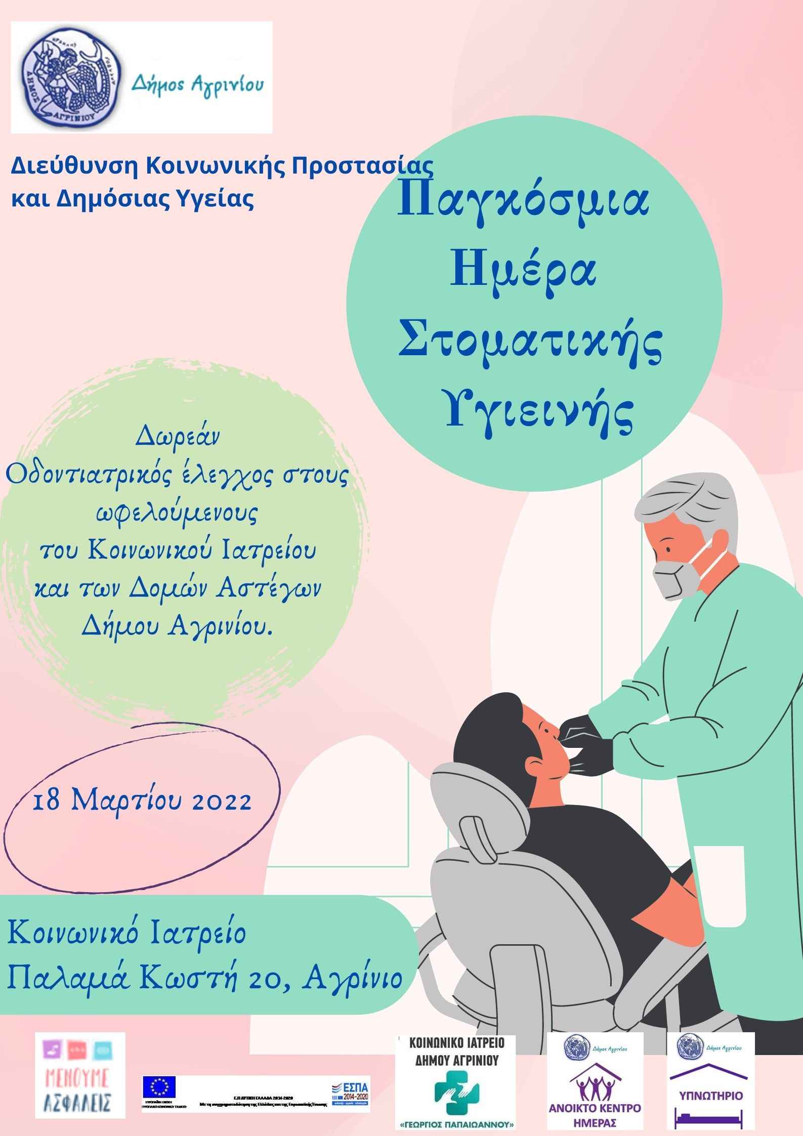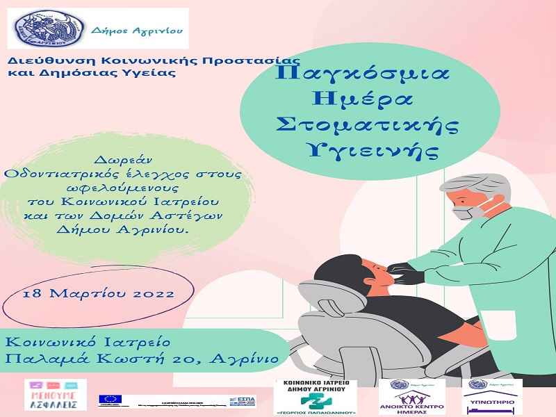 Με  αφορμή την Παγκόσμια Ήμερα Στοματικής  Υγιεινής που τιμάται την 20η  Μαρτίου, οι κοινωνικές δομές της   Διεύθυνσης Κοινωνικής Προστασίας και Δημόσιας Υγείας  Δήμου Αγρινίου θα πραγματοποιήσουν δράσεις ενημέρωσης και ευαισθητοποίησης στην κοινότητα.