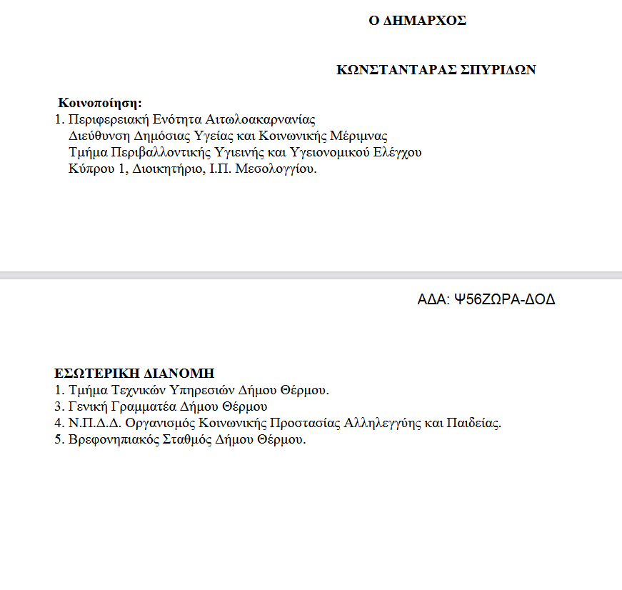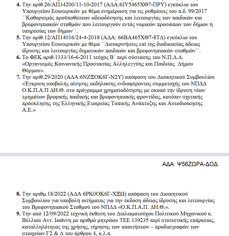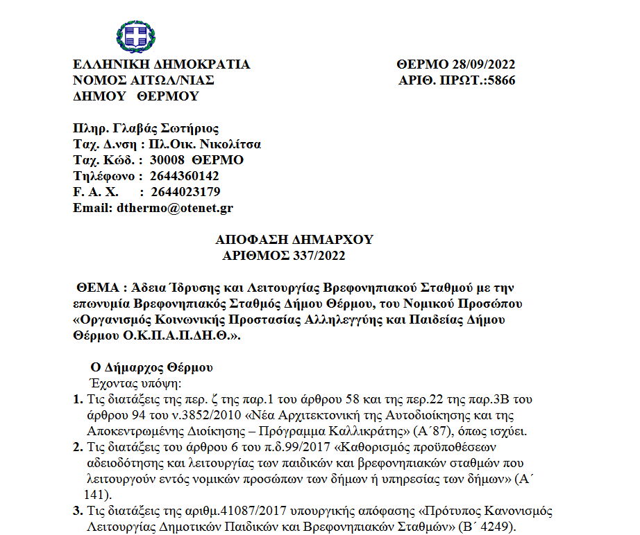 Άδεια Ίδρυσης και Λειτουργίας Βρεφονηπιακού Σταθμού με την επωνυμία Βρεφονηπιακός Σταθμός Δήμου Θέρμου, του Νομικού Προσώπου «Οργανισμός Κοινωνικής Προστασίας Αλληλεγγύης και Παιδείας Δήμου Θέρμου Ο.Κ.Π.Α.Π.ΔΗ.Θ.».
