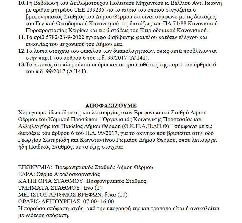 Χορηγήθηκε η άδεια ίδρυσης και λειτουργίας στον Βρεφονηπιακό Σταθμό Δήμου Θέρμου του Νομικού Προσώπου ́ ́Οργανισμός Κοινωνικής Προστασίας και Αλληλεγγύης και Παιδείας Δήμου Θέρμου (Ο.Κ.Π.Α.Π.ΔΗ.Θ) ́ ́ σύμφωνα με τις διατάξεις του άρθρου 6 του Π.Δ. 99/2017, για το ακίνητο που βρίσκεται στην οδό Γεωργίου Σωτηριάδη και Κωνσταντίνου Ρωμαίου Δήμου Θέρμου, όπου λειτουργεί