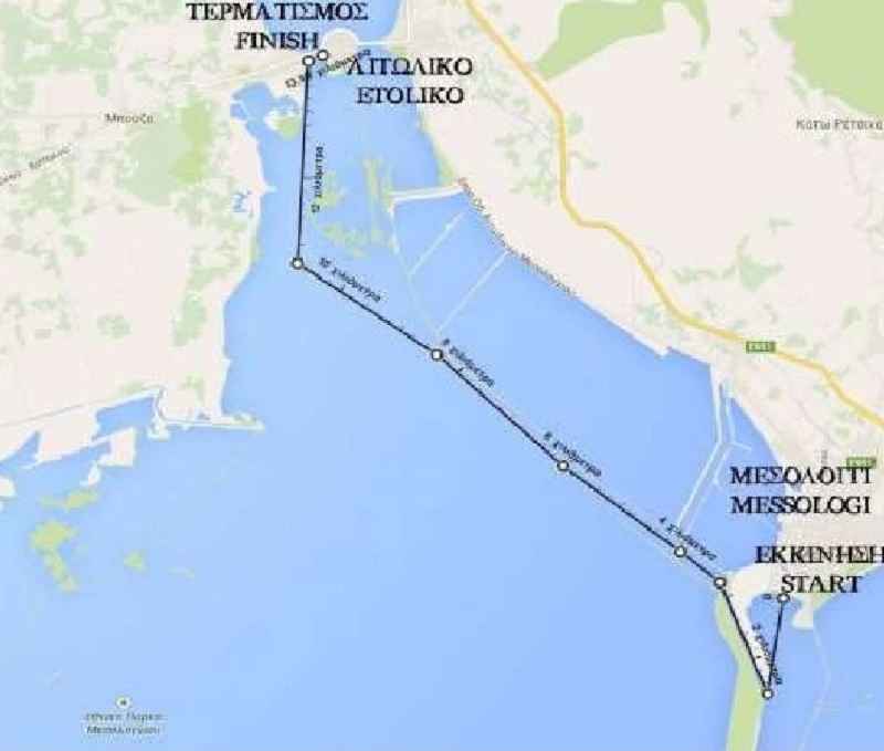 Η διαδρομή των 14χλμ έχει σημείο εκκίνησης το λιμάνι του Μεσολογγίου. Μετά την εκκίνηση οι αγωνιζόμενοι θα κινηθούν νότια προς την αρχή του διαύλου στο λιμάνι του Μεσολογγίου. Έπειτα θα κατευθυνθούν βορειοδυτικά για 2.44χλμ έως το διβάρι διαύλου όπου θα περάσουν από την πόρτα πλάτους 3μ του διβαριού. Η διαδρομή συνεχίζει βορειοδυτικά για 4,33χλμ. Στη συνέχεια η διαδρομή βγαίνει από το δίαυλο και συνεχίζει βορειοδυτικά για 2,8χλμ όπου οι αγωνιζόμενοι μπαίνουν στο δυτικό δίαυλο και συνεχίζουν για 2,6χλμ με κατεύθυνση προς το βορρά έως τον τερματισμό στα δυτικά γεφύρια του Αιτωλικού. Το βάθος σε όλο το μήκος της διαδρομής είναι 0,50-1,00μ. (βλ. άρθρο 12)