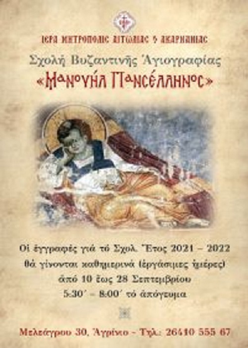 Από την Παρασκευή 10 Σεπτεμβρίου 2021 πραγματοποιούνται οι εγγραφές στη Σχολή Βυζαντινής Αγιογραφίας «ΜΑΝΟΥΗΛ ΠΑΝΣΕΛΗΝΟΣ» της Ιεράς Μητροπόλεως Αιτωλίας και Ακαρνανίας που βρίσκεται στο Αγρίνιο (Ταχ. Διεύθ. Μελεάγρου 30 – τηλ. 26410 55567).