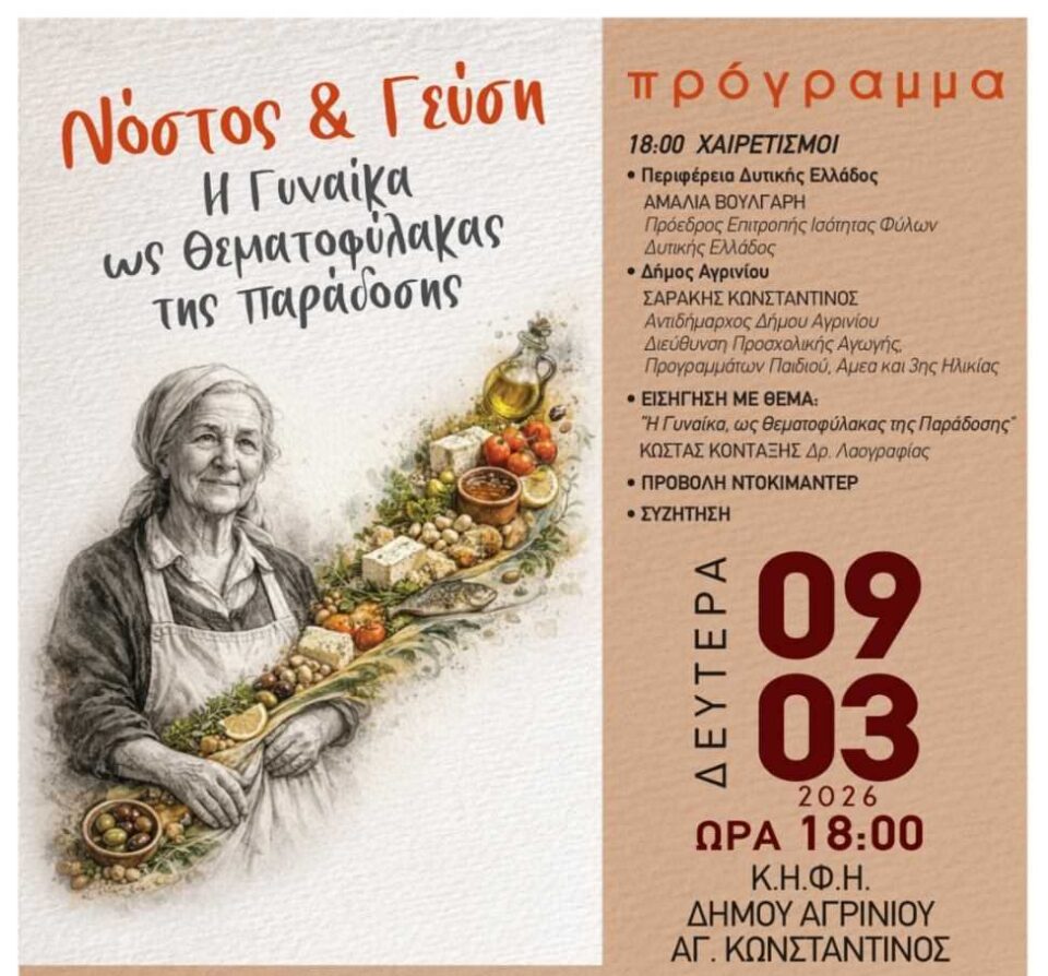 Η Διεύθυνση Προσχολική Αγωγής, Προγραμμάτων Παιδιού, ΑμεΑ και Τρίτης Ηλικίας του Δήμου Αγρινίου, σε συνεργασία με την Περιφέρεια Δυτικής Ελλάδας και την Περιφερειακή Επιτροπή Ισότητας Φύλων Δυτικής Ελλάδας, διοργανώνουν εκδήλωση με τίτλο «Νόστος & Γεύση – Η Γυναίκα ως Θεματοφύλακας της Παράδοσης», με αφορμή την Ημέρα της Γυναίκας.