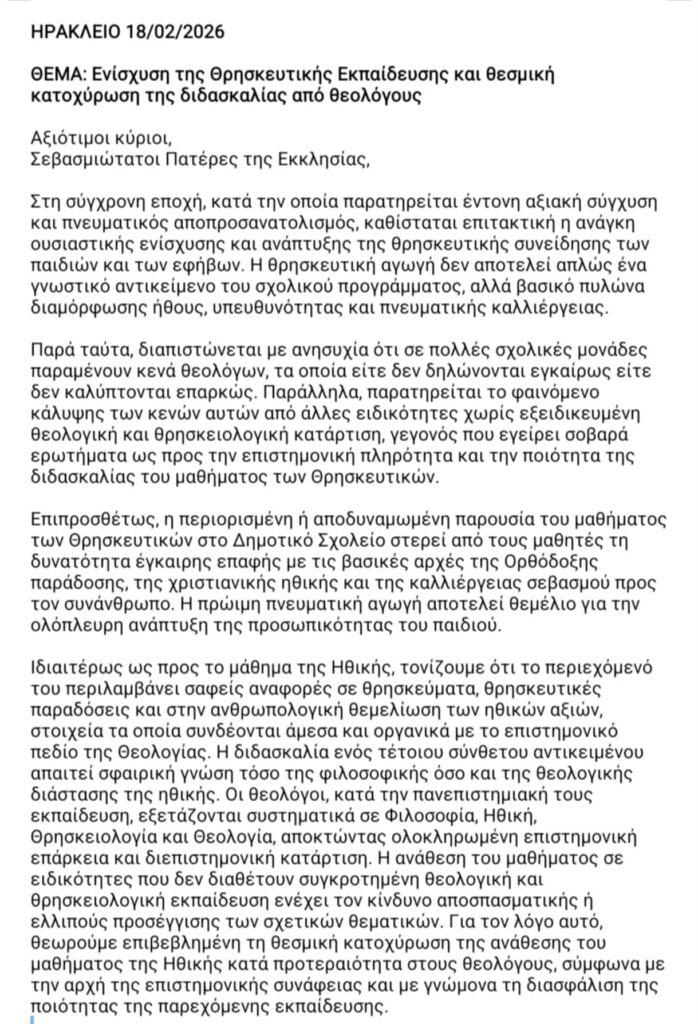 Ζητούμε την άμεση κάλυψη όλων των κενών και τον ουσιαστικό σεβασμό στον ρόλο του θεολόγου στη δημόσια εκπαίδευση.