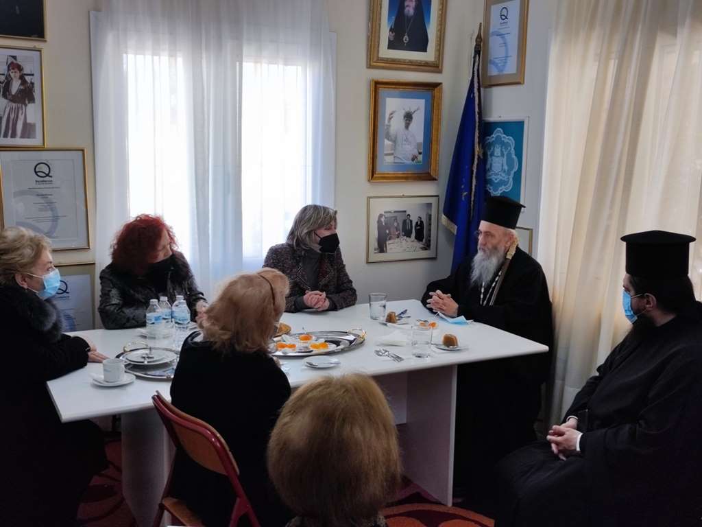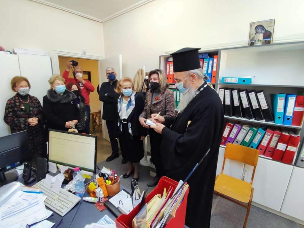 Τον Σεβασμιώτατο υποδέχθηκαν η Ιδρύτρια και Επίτιμη Πρόεδρος του Εργαστηρίου κ. Μαρία Τσούτσου, η Πρόεδρος κ. Διονυσία Σαμαντά και μέλη του Διοικητικού Συμβουλίου. Αφού τον καλωσόρισαν και τον ευχαρίστησαν για την ανταπόκριση στην πρόσκληση, τον ξενάγησαν στους χώρους των εργαστηρίων, των γραφείων και του οικοτροφείου.