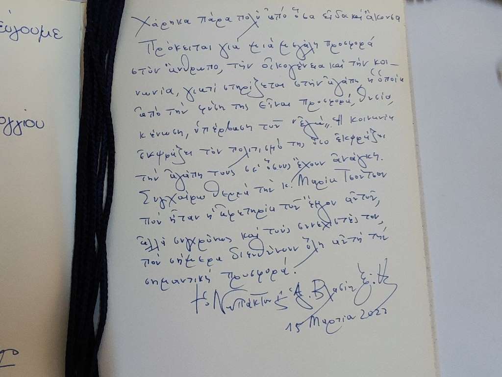 Ο Σεβασμιώτατος ευλόγησε τα παιδιά και τους εκπαιδευτές και συνομίλησε μαζί τους. Δήλωσε εντυπωσιασμένος από το έργο που προσφέρει το Εργαστήρι, από την τάξη και την ποιότητα των παροχών και συνεχάρη όλους και όλες για την εργασία τους και την προσφορά τους, τονίζοντας ότι ο πολιτισμός μιας κοινωνίας φαίνεται από τον τρόπο που αντιμετωπίζει και φροντίζει αυτά τα παιδιά με τις ιδιαίτερες ανάγκες. Υποσχέθηκε δε, σύντομα, να επισκεφθεί και να ευλογήσει και τις υπόλοιπες εγκαταστάσεις στο Αγρίνιο και το Μεσολόγγι.