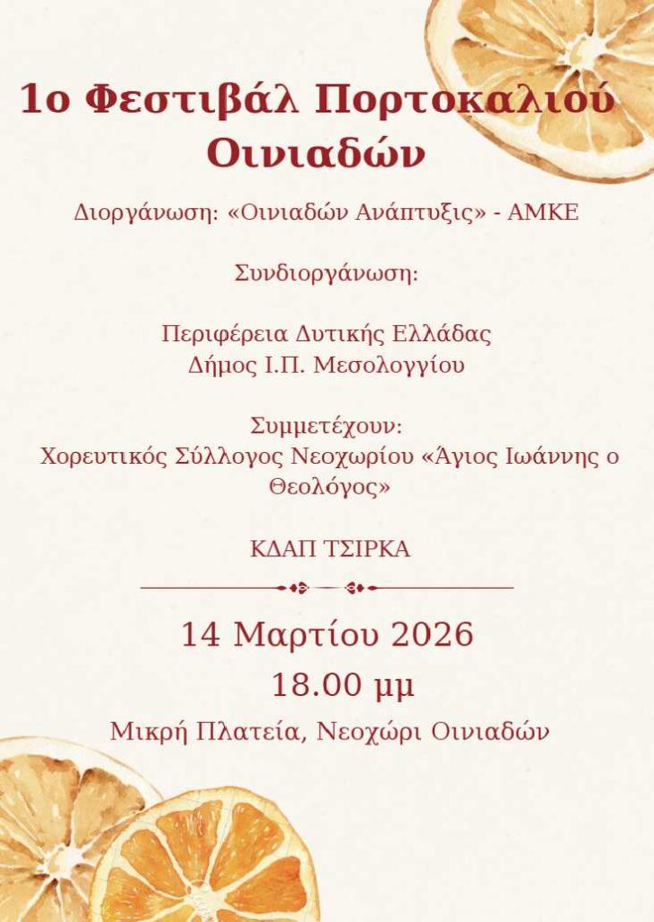 Σήμερα η προσπάθεια αυτή συνεχίζεται μέσω της πρωτοβουλίας που οραματίστηκε και σχεδίασε η «Οινιαδών Ανάπτυξις» – ΑΜΚΕ, για την ανάδειξη της σημασίας της καλλιέργειας των Εσπεριδοειδών για τον τόπο μας και τη σύνδεση με την τοπική οικονομία, κοινωνία και πολιτισμό, διοργανώνοντας το «1ο Φεστιβάλ Πορτοκαλιού Οινιαδών». Μια εκδήλωση που υποστηρίζει η Περιφέρεια Δυτικής Ελλάδας και ο Δήμος Ι.Π. Μεσολογγίου και αναμένεται να λάβει χώρα το Σάββατο 14 Μαρτίου 2026 και ώρα 6:00 το απόγευμα στη Μικρή Πλατεία στο Νεοχώρι Οινιαδών.