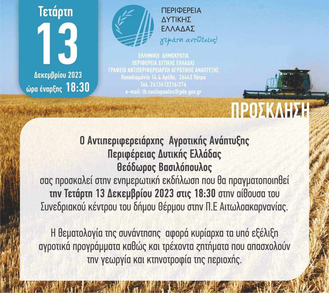 Ενημερωτική εκδήλωση από την Περιφέρεια Δυτικής Ελλάδας, θα πραγματοποιηθεί την Τετάρτη 13 Δεκεμβρίου 2023 στις 06:30 μ.μ. στην Αίθουσα του Συνεδριακού Κέντρου του Δήμου Θέρμου.