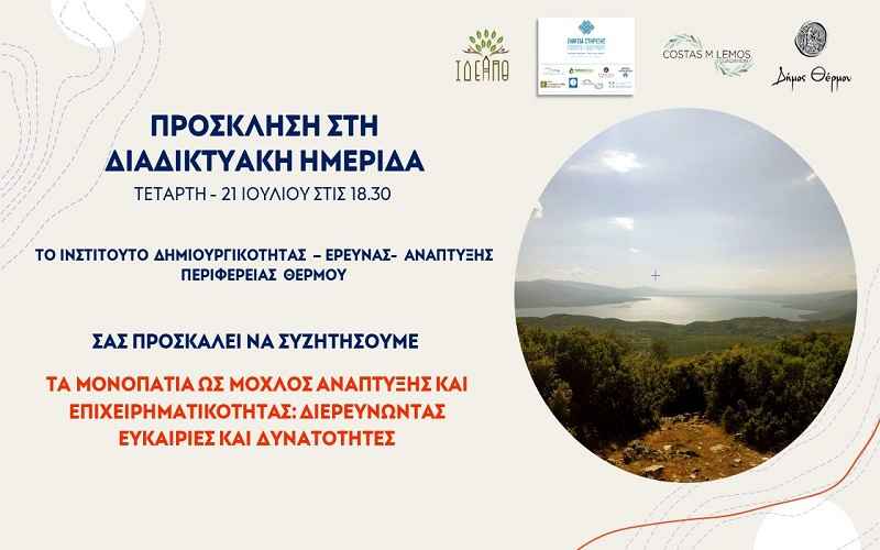 Το Ινστιτούτο Δημιουργικότητας Έρευνας Ανάπτυξης Περιφέρειας Θέρμου την Τετάρτη 21 Ιουλίου 2021 στις 18:30, διοργανώνει Διαδικτυακή Ημερίδα με τίτλο: Τα μονοπάτια ως μοχλός ανάπτυξης και επιχειρηματικότητας – Διερευνώντας ευκαιρίες και δυνατότητες.