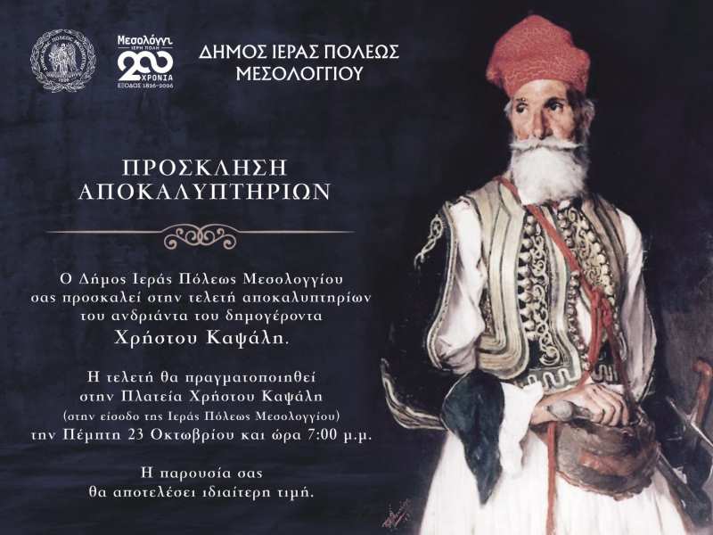 Ο Δήμος Ιεράς Πόλεως Μεσολογγίου, στο πλαίσιο των εκδηλώσεων προετοιμασίας για τη Διακοσιοστή Επέτειο της Εξόδου, διοργανώνει την τελετή αποκαλυπτηρίων του αγάλματος του Δημογέροντα Χρήστου Καψάλη, έργο του γλύπτη Ευάγγελου Τύμπα. Η εκδήλωση θα πραγματοποιηθεί στην πλατεία στηνείσοδο της πόλεως, έμπροσθεν της Πύλης, την Πέμπτη 23 Οκτωβρίου 2025, στις 19:00.