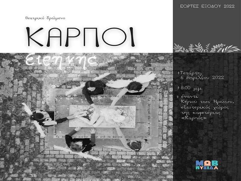 Στο πλαίσιο των επετειακών εκδηλώσεων για την Έξοδο των Ελεύθερων Πολιορκημένων σήμερα παρουσιάζονται οι «Καρποί Ειρήνης» το θεατρικό δρώμενο με την διοργάνωση του ΚΔΑΠ ΑΜΕΑ «Μωβ Πυξίδα» και του Πνευματικού Κέντρου. Το δρώμενο έχει προγραμματιστεί για τις 8 το απόγευμα έναντι του Κήπου των Ηρώων.