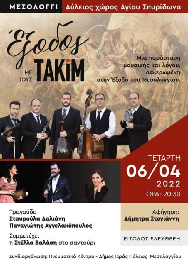 Η μέρα κλείνει με την μεγάλη συναυλία με τίτλο «Έξοδος» στον αύλειο χώρο του Ι.Ν. Αγίου Σπυρίδωνος. Πρόκειται για μια παράσταση μουσικής και λόγου αφιερωμένη στην Έξοδο του Μεσολογγίου από τους «ΤΑΚΙΜ». Αφηγείται η Δήμητρα Στογιάννη, στο τραγούδι θα είναι οι Σταυρούλα Δαλιάνη και Παναγιώτης Αγγελακόπουλος και στο σαντούρι η Στέλλα Βαλάση!