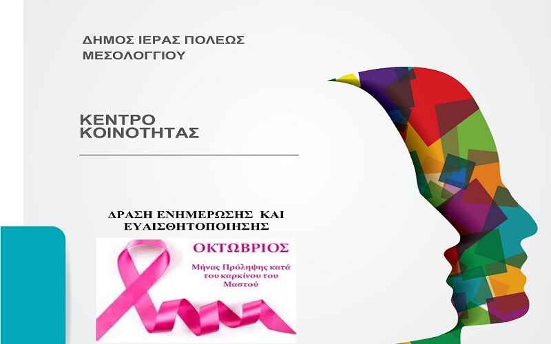 Στο πλαίσιο αυτό και με αφορμή την παγκόσμια ημέρα κατά του καρκίνου του μαστού, το Κέντρο Κοινότητας με Παράρτημα Ρομά του Αυτοτελούς Τμήματος Κοινωνικής Προστασίας, Παιδείας και Πολιτισμού Δήμου Ι.Π. Μεσολογγίου θα πραγματοποιήσει