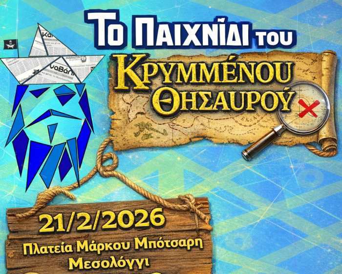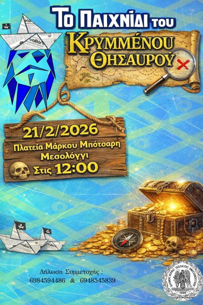 Ο Δήμος Ιεράς Πόλεως Μεσολογγίου, στο πλαίσιο των αποκριάτικων εκδηλώσεων, διοργανώνει το Σάββατο 21 Φεβρουαρίου το καθιερωμένο παιχνίδι του Κρυμμένου Θησαυρού, στην Πλατεία Μάρκου Μπότσαρη, προσκαλώντας μικρούς και μεγάλους να συμμετάσχουν σε μια διασκεδαστική περιπέτεια γεμάτη γρίφους, δοκιμασίες και εκπλήξεις.