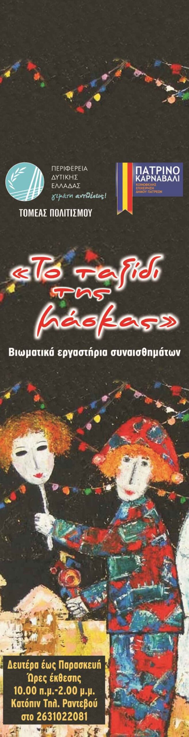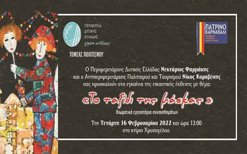 Την  πρωτότυπη εικαστική  έκθεση με τίτλο «Το ταξίδι της μάσκας»,  πρόκειται να εγκαινιάσει Ο Αντιπεριφερειάρχης Πολιτισμού και Τουρισμού Νικόλαος Κοροβέσης, την Τετάρτη 16 Φεβρουαρίου 2022,  στις  12 το μεσημέρι στο Κτίριο Χρυσόγελου, στο Μεσολόγγι.  Η έκθεση  που μυεί τους επισκέπτες στο πνεύμα του Πατρινού Καρναβαλιού και της μακρόχρονης ιστορίας του,  πραγματοποιείται σε συνεργασία με  την Κοινωφελή Επιχείρηση Δήμου Πατρέων «Καρναβάλι Πάτρας» .