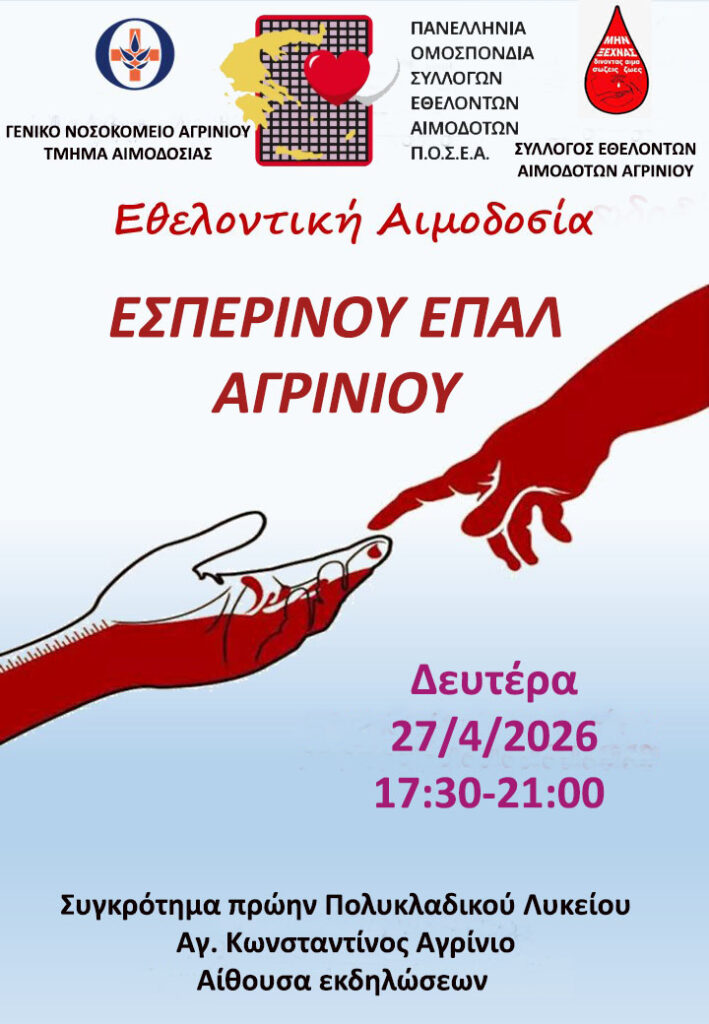 Ενημερώνουμε ότι τη Δευτέρα 27 Απριλίου 2026 θα πραγματοποιηθεί η ετήσια Εθελοντική Αιμοδοσία του Εσπερινού ΕΠΑ.Λ. Αγρινίου, στην αίθουσα εκδηλώσεων του σχολείου μας, σε συνεργασία με το Τμήμα Αιμοδοσίας του Γενικού Νοσοκομείου Αγρινίου και τον Σύλλογο Εθελοντών Αιμοδοτών Αγρινίου.