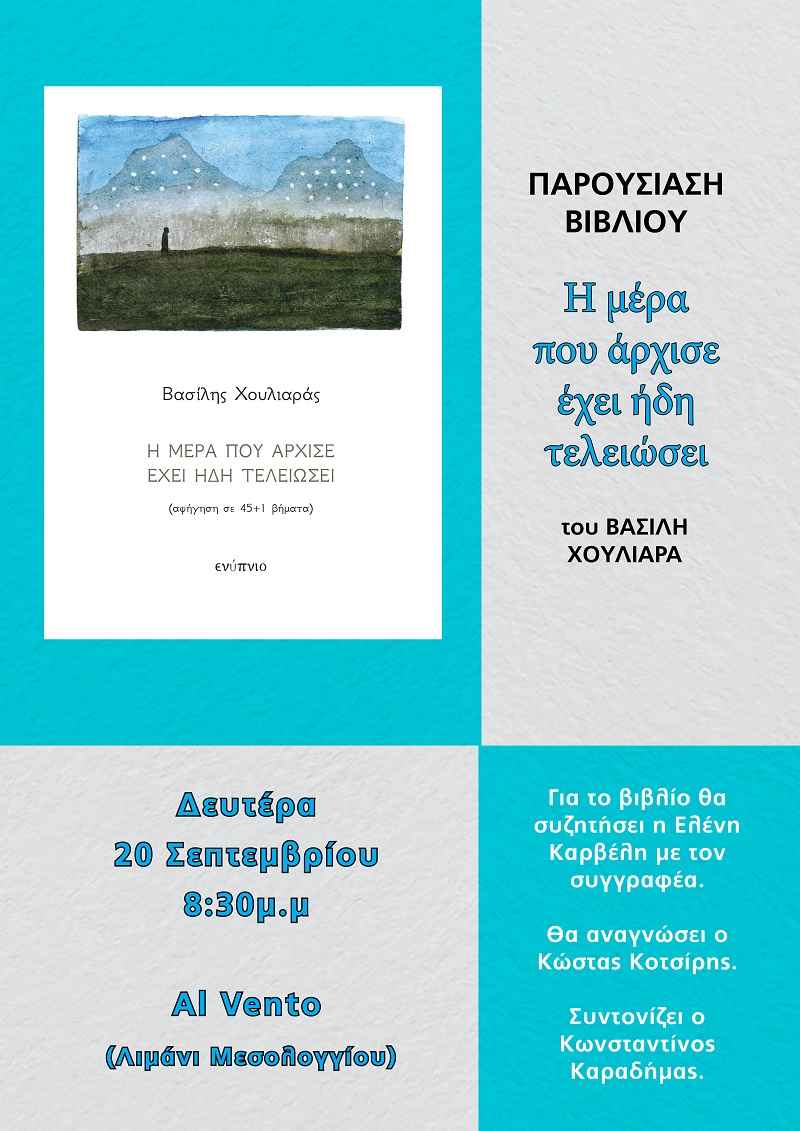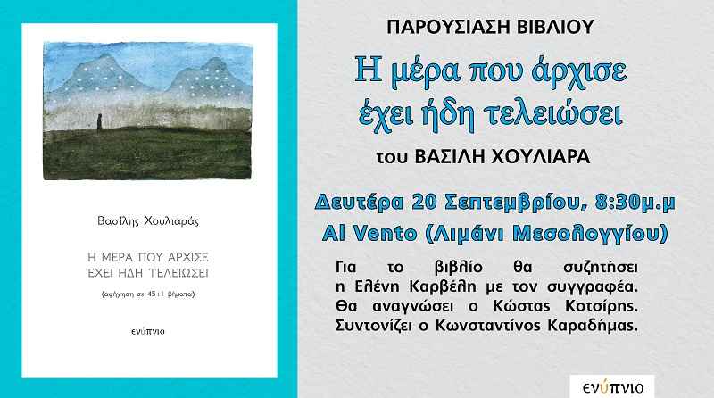 Παρουσίαση του βιβλίου “Η μέρα που άρχισε έχει ήδη τελειώσει”, τη Δευτέρα 20 Σεπτέμβρη, στις 8.30 μ.μ.,στο Al Vento (Λιμάνι Μεσολογγίου).