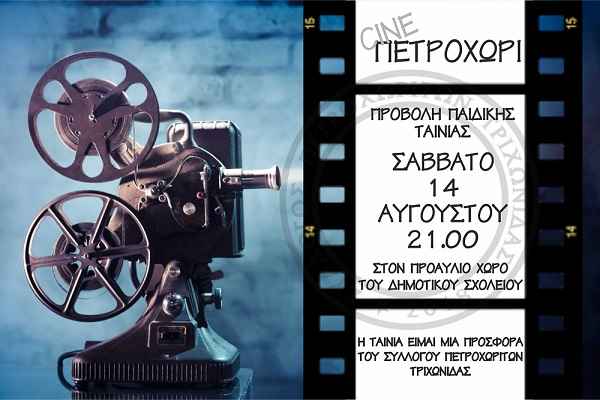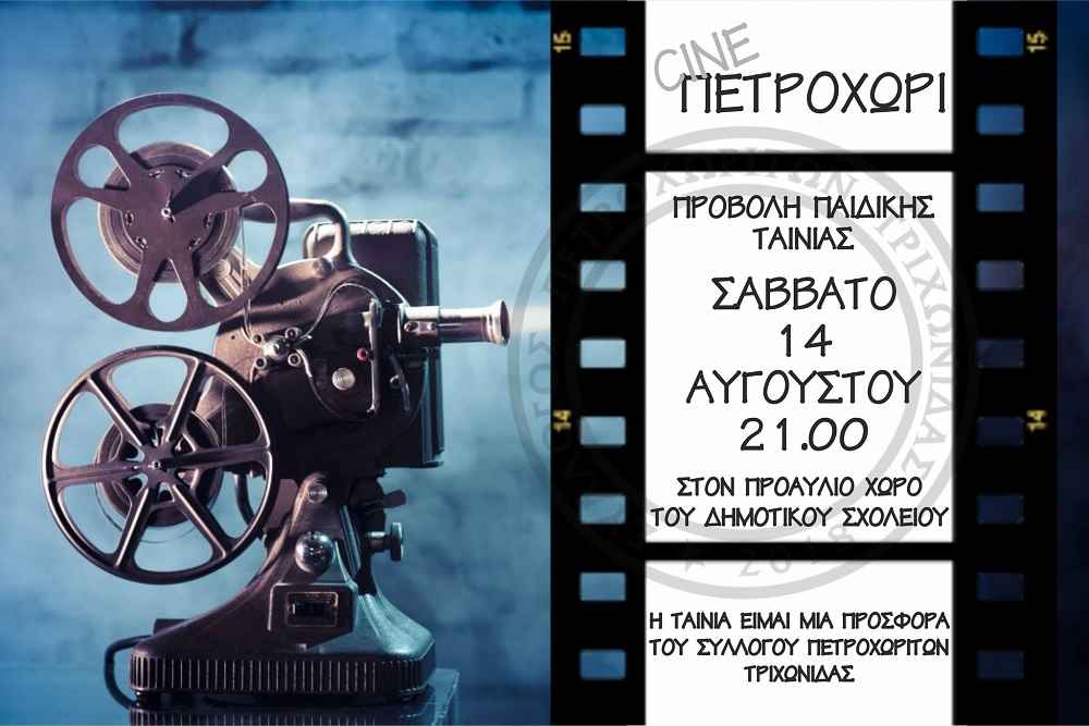 Σήμερα , Σάββατο 14 Αυγούστου 2021 και ώρα 9:00 μ.μ., ο Σύλλογος Πετροχωριτών Τριχωνίδας, διοργανώνει προβολή παιδικής ταινίας, στον προαύλιο χώρο του δημοτικού σχολείου στο Πετροχώρι.