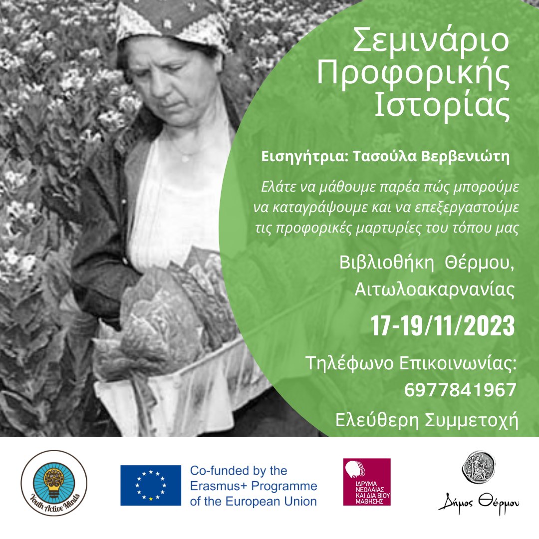 Διοργάνωση Σεμιναρίου Προφορικής Ιστορίας με την ιστορικό Τασούλα Βερβενιώτη, στη Δημοτική Βιβλιοθήκη του Θέρμου, στις 17-19 Νοεμβρίου 2023.