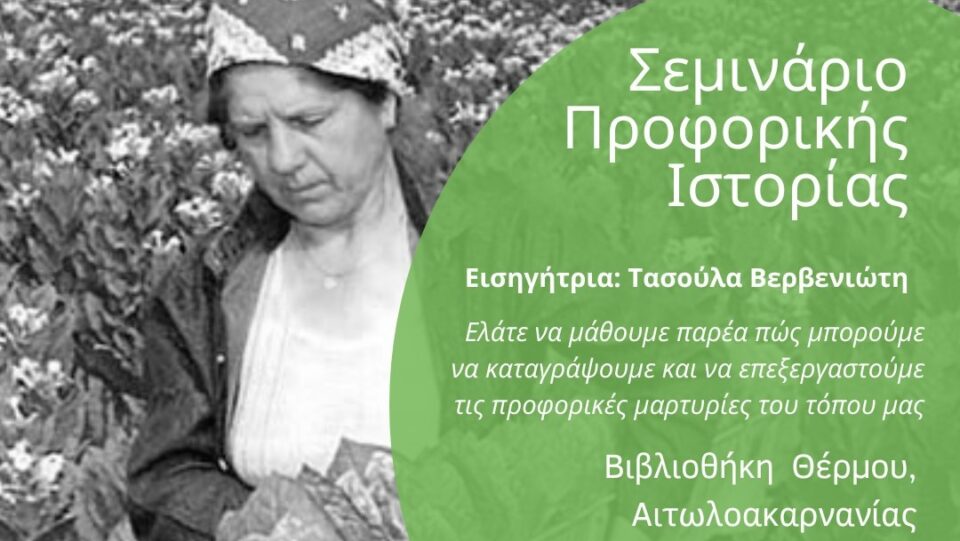 Καλούμε όσες και όσους θέλουν να συμμετέχουν στο Σεμινάριο Προφορικής Ιστορίας με την ιστορικό Τασούλα Βερβενιώτη, στη Δημοτική Βιβλιοθήκη του Θέρμου, στις 17-19 Νοεμβρίου 2023 και να συγκροτήσουν μια τοπική ομάδα Προφορικής Ιστορίας.