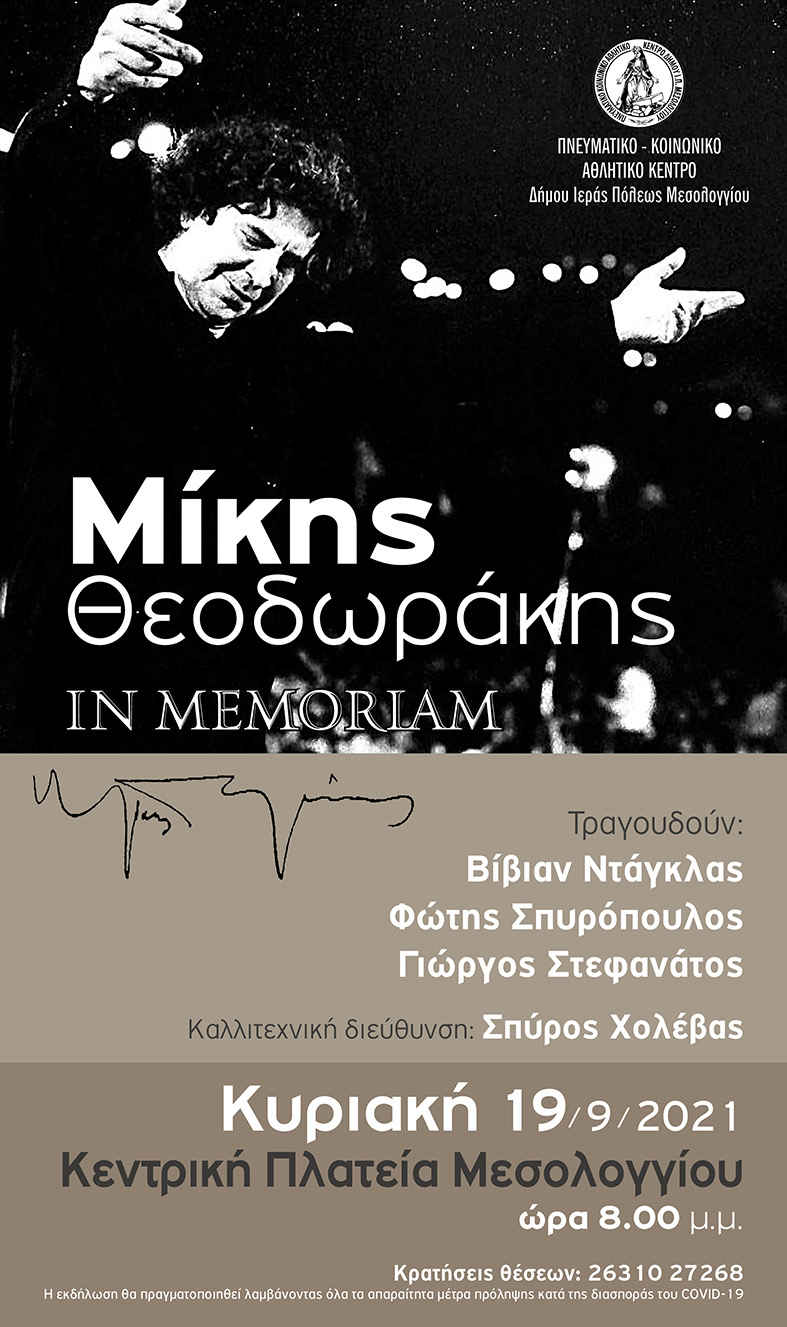 Ο Δήμος και το Πνευματικό Κέντρο Ι.Π. Μεσολογγίου διοργανώνουν συναυλία στην κεντρική πλατεία της πόλης με τραγούδια του αξέχαστου μουσικοσυνθέτη που θα αποδώσουν οι Βίβιαν Ντάγκλας, Φώτης Σπυρόπουλος και Γιώργος Στεφανάτος υπό την καλλιτεχνική διεύθυνση του Σπύρου Χολέβα.