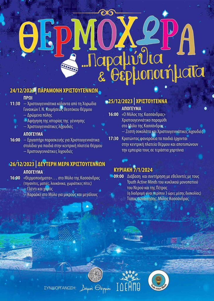 Το Ι.Δ.Ε.Α.Π.Θ. (Ινστιτούτο Δημιουργικότητας Έρευνας Ανάπτυξης Περιφέρειας Θέρμου) σε συνεργασία με τον Δήμο Θέρμου, σας προσκαλεί στις Χριστουγεννιάτικες Εκδηλώσεις!